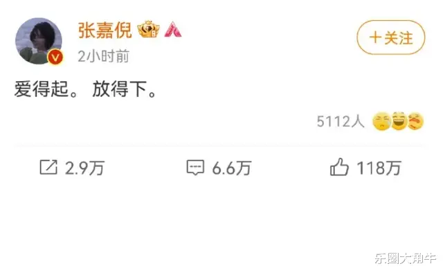 网友们则不断喊话张嘉倪,终于一天之后,在深夜张嘉倪发了简单的6个字:爱得起,放得下。