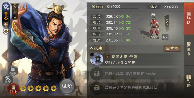 SP曹操,本赛季的封面人物之一,在这赛季能心愿的武将里面算是最好用的一个。经纬山河和三足鼎立羁绊都十分好用,本身是一个增伤版姜维,到后期的增伤极高,输出也是很爆炸。拆技对酒当歌也是一个必备级别的战法,非常值得放青睐和心愿的。