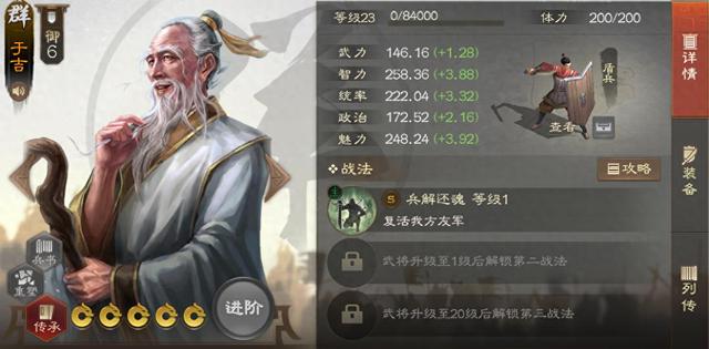 建议起码要有一张,三仙队伍用于吉比张角好用很多。最好是有两张,拆一下战法,20%的免伤加常驻圆形三格的断粮光环,泛用性很不错。