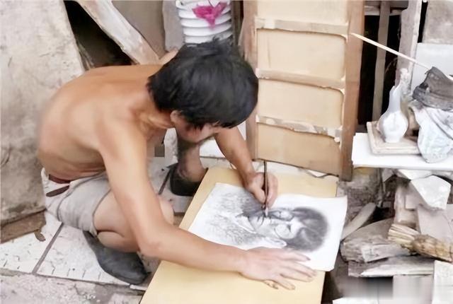 为了维持基本的生活,他开始在街头拾荒,将捡来的废弃木板和纸张作为画布,用木炭作为画笔,继续他的创作。