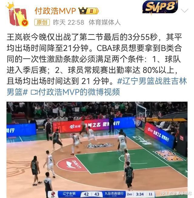 本赛季至今,王岚嵚已经参加了37场比赛,仅错过一场,平均每场上场时间恰好为21分钟。根据他的B类合同中的一次性激励条款,目前确实处于一个关键节点。不过,这件事与辽宁男篮并无直接关联。
