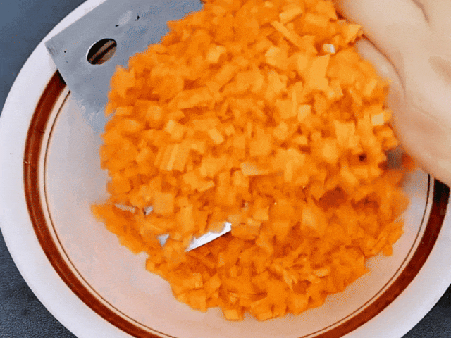 另外准备些胡萝卜切成小丁丁,泡好的粉条+老抽和食用油搅匀,腌好的南瓜丝放纱布中捏出多余的水分后剁碎。