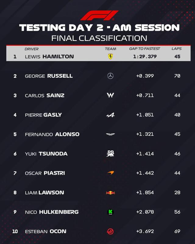 斯托尔排在第六,紧随其后的是红牛车手劳森,他在早些时候因为RB21的水冷系统问题失去了一些赛道时间。杜汉以第八名完成测试,领先队友加斯利。