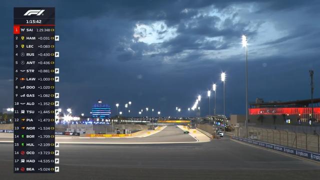 随着夜幕降临,塞恩斯继续领跑,并以1:29.348的成绩牢牢占据榜首,领先汉密尔顿上午的最快圈速0.031秒。
