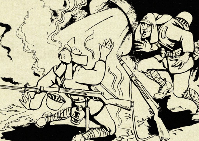 男女老少毫不犹豫地冲上前线,许多村民甚至毫不退缩地用刀和刺刀与敌人搏斗。