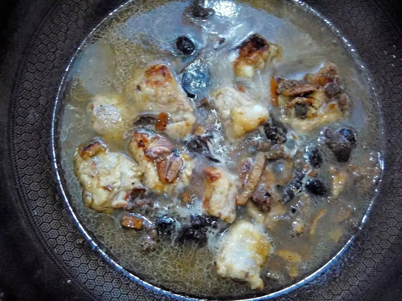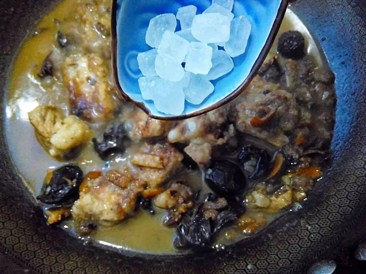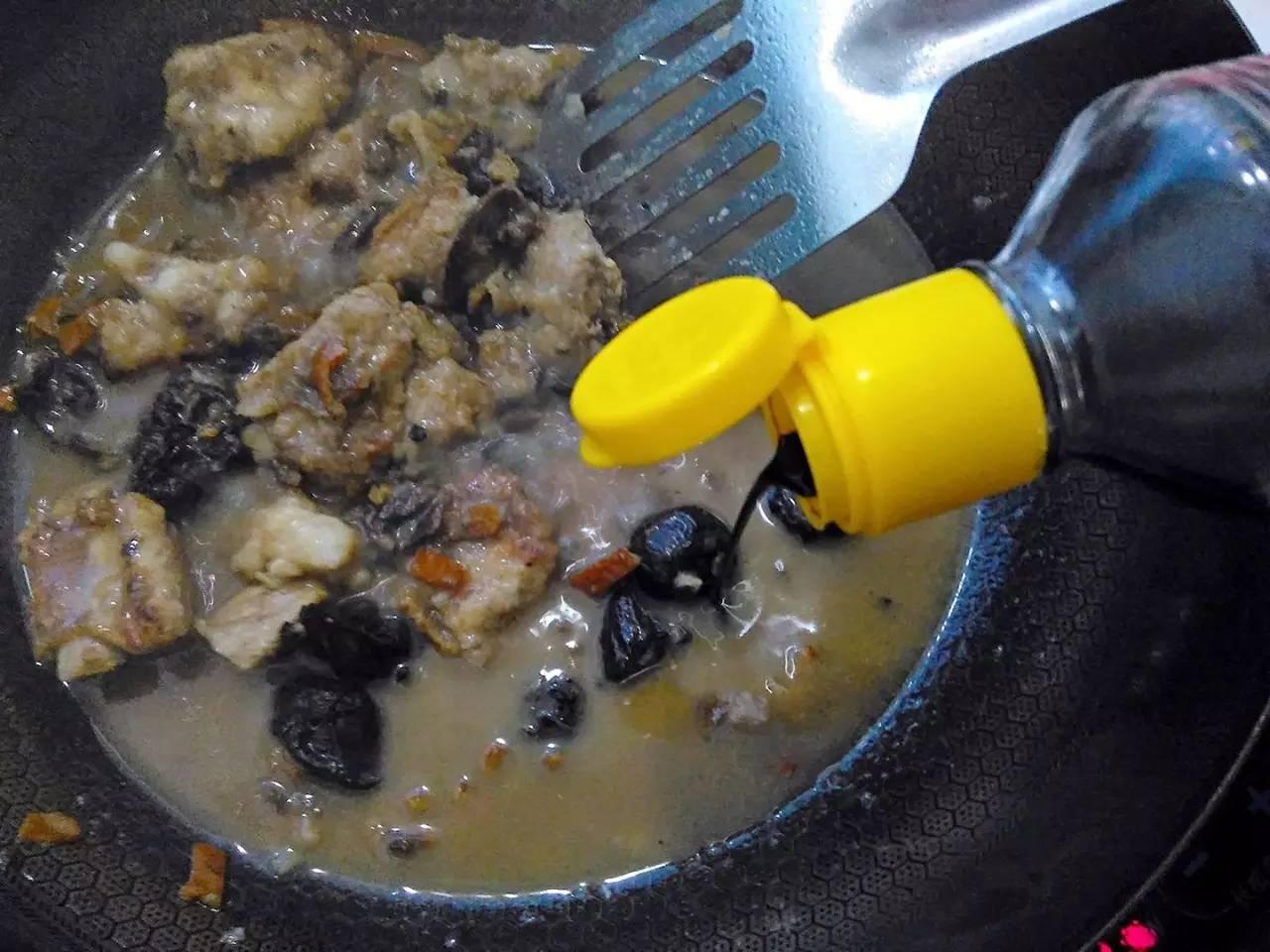 再加入一勺生抽,一勺老抽,两勺料酒。