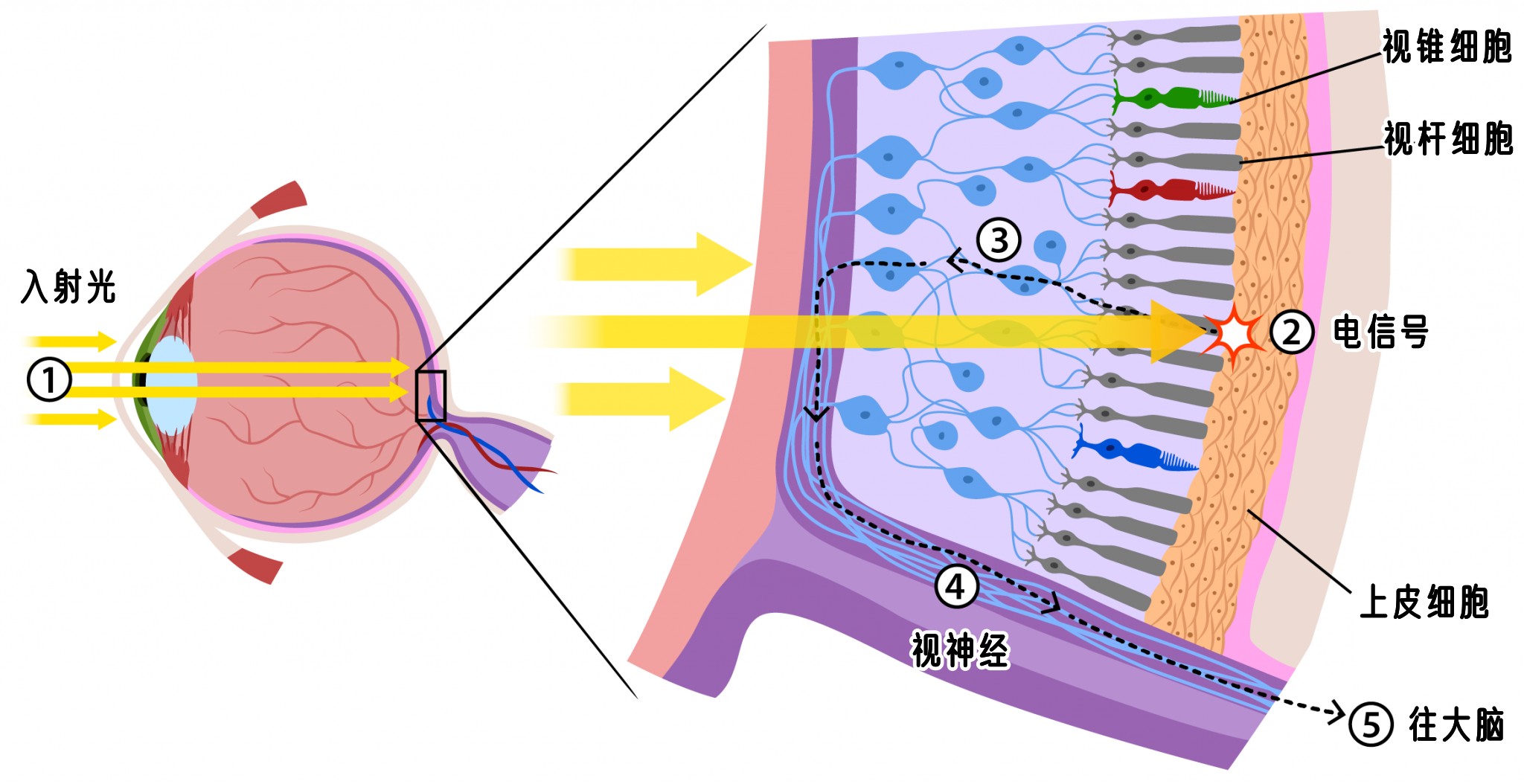 感光细胞主要分两种,一种是视锥细胞,一种是视杆细胞。其中视锥细胞又有三种,它们分别对三种不同波长的光刺激敏感,而这三种敏感波长就分别对应了红、绿、蓝三种视觉颜色,三种视锥细胞接收的电信号就会被大脑处理成这三种不同颜色,最终合成一个彩色的图像。可以说我们平常看到的绝大部分图像都是通过视锥细胞获得的,它的分布在眼球焦点的视网膜黄斑区特别中央凹附近尤为密集。