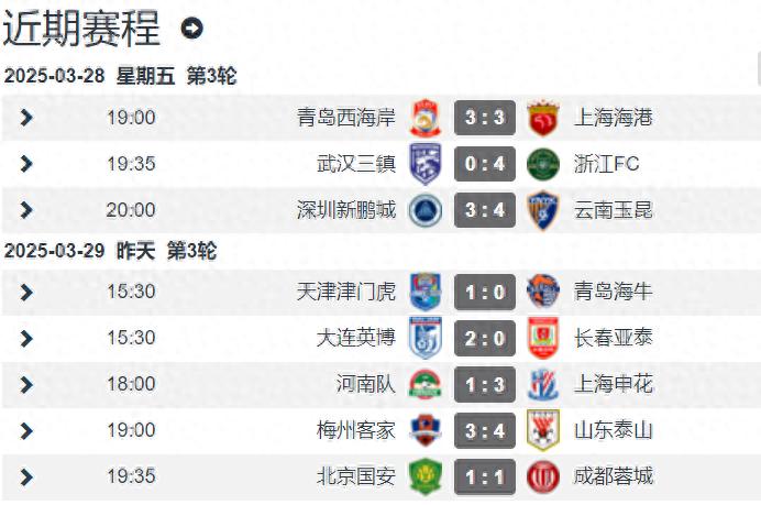 中超第3轮战况:青岛西海岸3-3上海海港,武汉三镇0-4浙江,深圳新鹏城3-4云南玉昆,天津津门虎1-0青岛海牛,大连英博2-0长春亚泰,河南1-3上海申花,梅州客家3-4山东泰山,北京国安1-1成都蓉城。