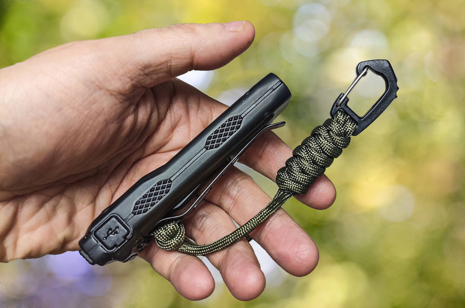 配合手绳,以及反面的下推扭,可以很方便将EDC23插入裤兜或者腰带,需要用时随手一拽就能照明,非常方便,这就是EDC手电的作用。