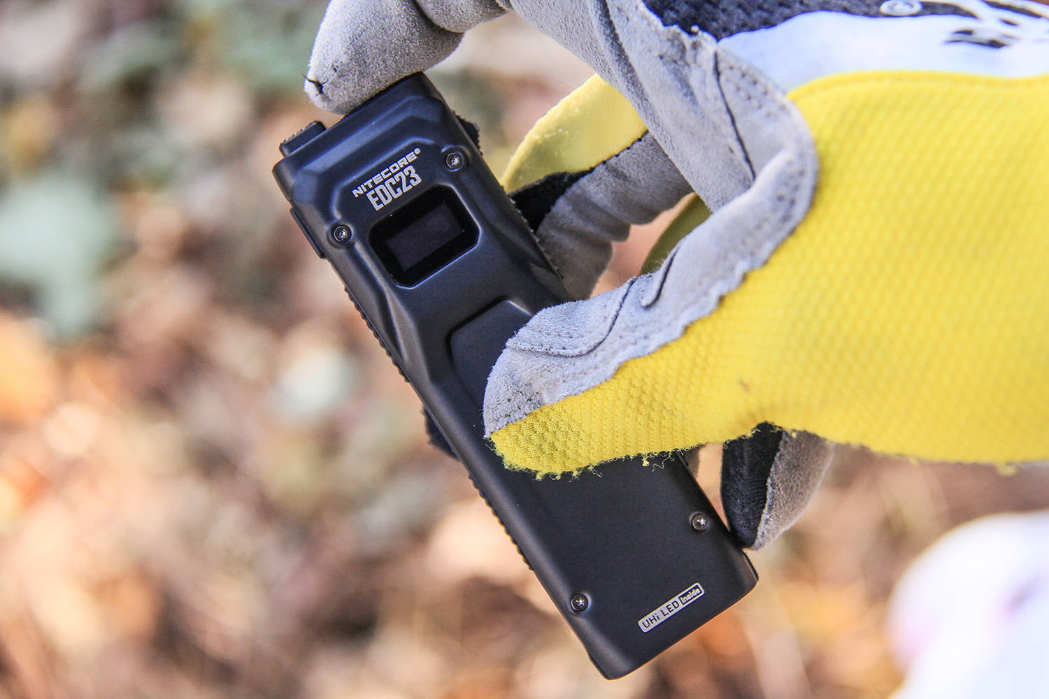EDC23的筒身缩短的可谓恰到好处,握住筒身,灯头刚好位于掌缘,拇指刚好能搭在开关的位置,即便带着手套也能方便按动。