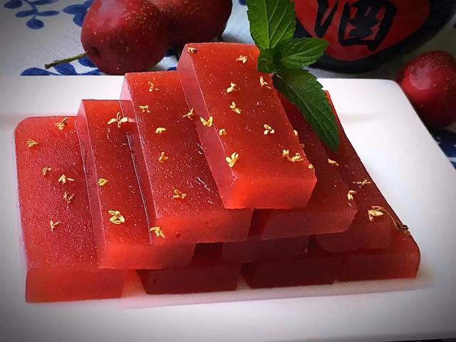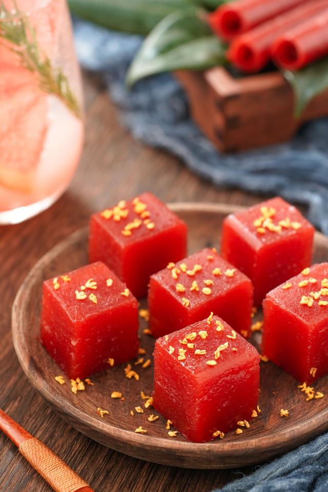 山楂糕是传统的甜点之一,口感酸甜软糯,十分适口。山楂糕不仅可以当做零食,还能帮助消化、促进肠胃健康。山楂中的有机酸和果胶能帮助排出体内多余的脂肪和毒素,同时也有利于心血管健康。