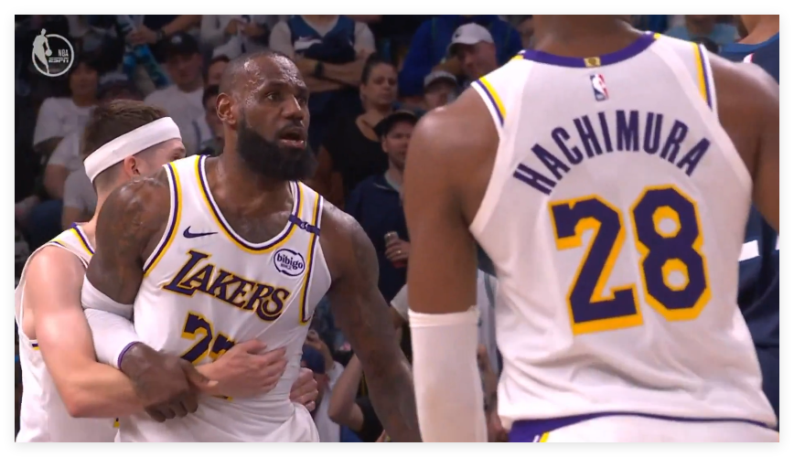 期间詹姆斯与戈贝尔激烈卡位,后者肘击老詹的后脑勺,随后老詹瞬间暴怒十分生气,里夫斯第一时间抱住老詹,裁判多次回放这一幕,最终吹罚戈贝尔一级恶意犯规。