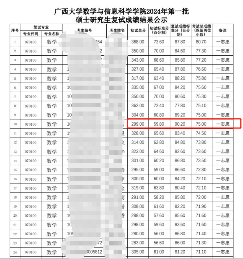 从2024年广西大学数学与信息科学学院的招录公告可以看到,剔除一些保送的名额外共对外招收47名硕士研究生,这意味着今年该学院进入复试的42人已经锁定于拟录取名单。