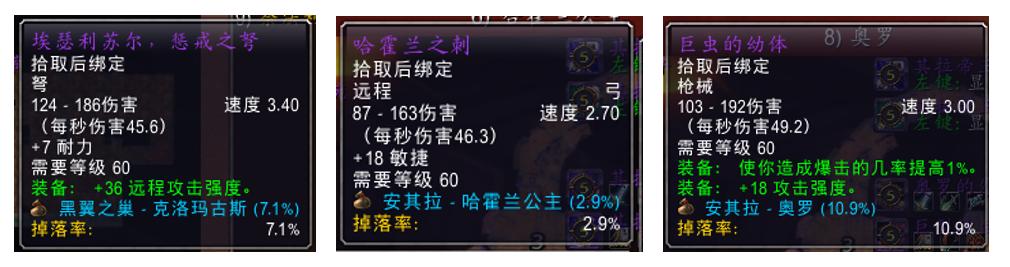 远程武器看下来,惩戒之弩也就是狗弩已经是NAXX老克蛛魔弩之前对于所有种族的猎人来说最好的弩了。那再看TAQ中的一把弓和一把枪里面,哈霍兰之刺收藏用就行了,没有伤害不是很好。有枪专精的矮人还可以选择奥罗枪"巨虫的幼体"伤害上限很高,虽然3的攻速即便加上箭袋也会卡平射,但是枪专精有命中优势也算是可以弥补一些奥罗枪的不足。另外,奥罗枪还是kbz们P5阶段的毕业装备,竞争激烈你懂的,所以矮人猎人们在拿装备时需要看实际情况掂量一下是回bwl拿惩戒弩还是在TAQ抢奥罗枪。