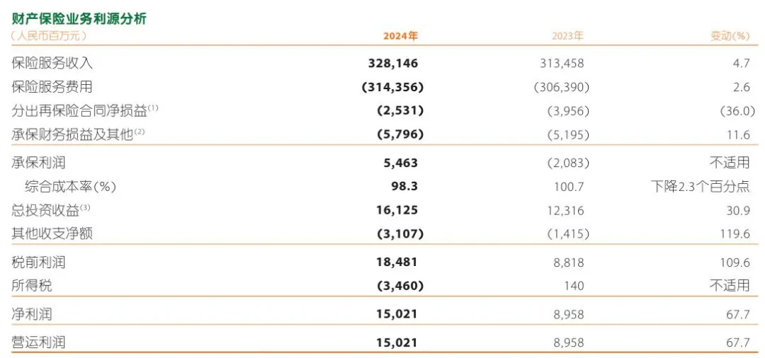 同时,平安产险的业绩也保持了稳定增长,实现保险服务收入3281.46亿元,同比增长4.7%;净利润150.21亿元,同比增长67.7%。得益于保证保险业务承保损失下降,该公司的整体综合成本率也同比优化2.3个百分点至98.3%。