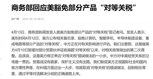 参考来源:光明网2025.04.14《商务部回应美豁免部分产品“对等关税”:这是修正错误做法的一小步!》