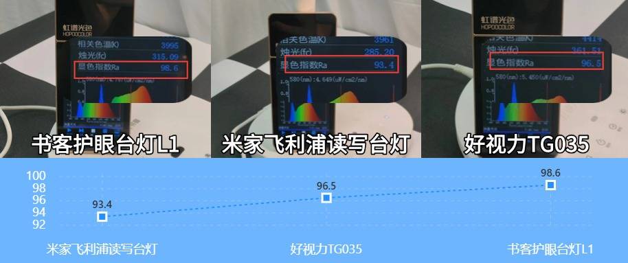 本次测试使用光谱仪对三款护眼台灯的显色指数进行测量,得出具体数据。