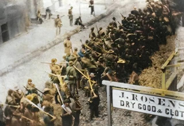 上图为 1864年7月美国内战时期南方联盟士兵的纵队在马里兰州弗雷德里克的东帕特里克街街上停留,摄影师正好在楼上的窗户目睹这一切于是拍下了这张照片。
