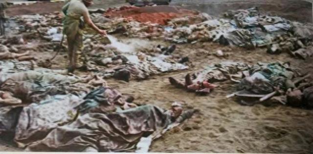 上图为1945年硫磺岛战役打响的第二天,一名美国海军陆战队员小心翼翼地走在阵亡的海军陆战队员中间在埋葬之前给地上的尸体喷洒消毒剂。此时硫磺岛的气温极其炎热,为了防止尸体腐烂发生瘟疫,从而在下葬之前需要先消毒。这场残酷的战役持续了36天,有近7000名美国海军陆战队员阵亡,另有 20,000 人受伤。而海军陆战队在这场战役中仅仅俘获216名日本士兵,其余日军全部阵亡,给美军留下了深深的阴影。