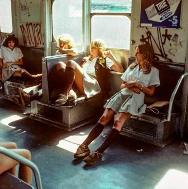 上图为80年代美国纽约的少女们乘坐地铁,那个时期纽约市的地铁系统是一个独特的世界,车厢里面充斥着涂鸦,而这也符合当时美国正流行起来的街头文化,并且当时的地铁车厢座位的摆放也非常宽松,并没有现在这么拥挤。