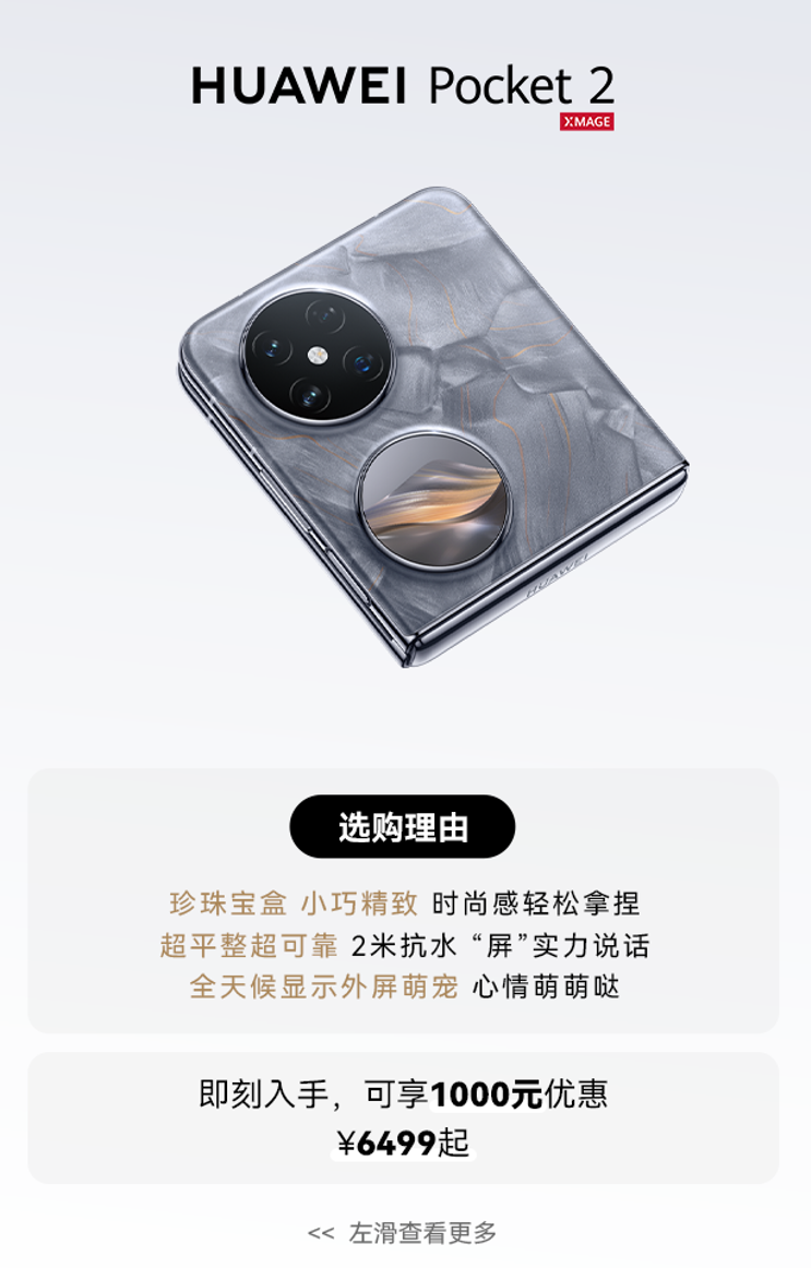 正值双十一,华为推出了一系列超值礼遇活动。现在入手华为Pocket 2即可享受优惠1000元的福利,到手价仅需6499元起。同时,还有至高12期分期免息以及一年期HUAWEI Care+等优惠活动。如果你对这款小折叠旗舰感兴趣,那么现在正是入手的好时机!