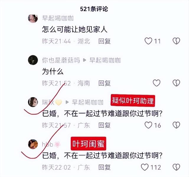 很快就有网友猜测,回应这句话的两位网友,分别是叶珂的助理和闺蜜。