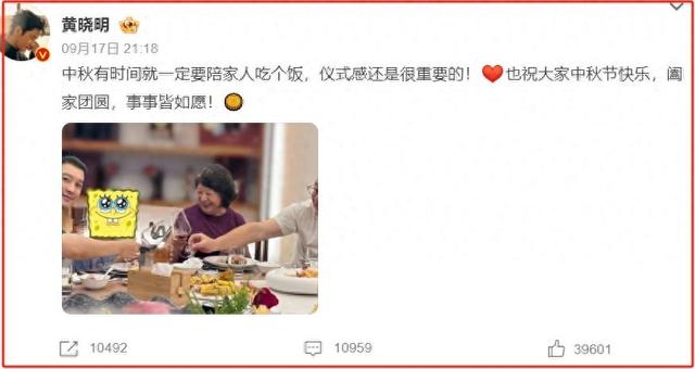 在这天,黄晓明也在自己的社交平台上发布了自己和家人一起吃饭的照片。