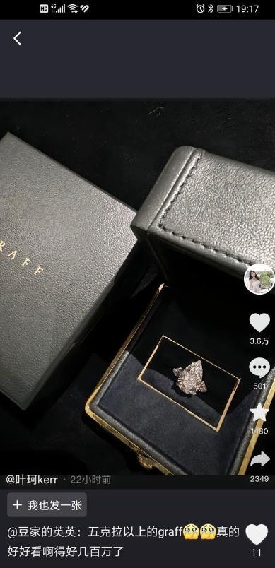 随着恋情的曝光,大家也发现叶珂社交平台晒出的一颗大钻戒。