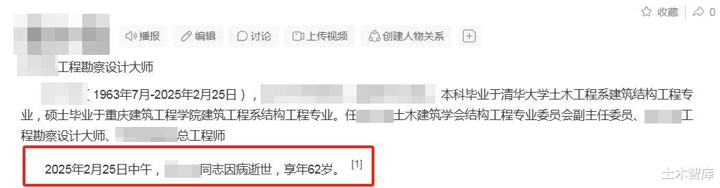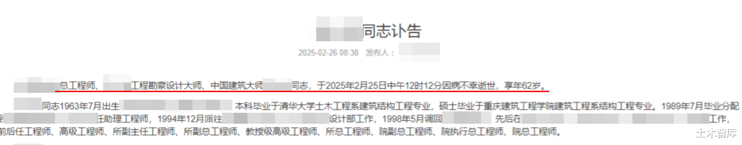 今天全国top10顶级大院发布讣告:总工程师、工程勘察设计大师、中国建筑大师,于2025年2月25日中午12时12分因病不幸逝世,享年62岁。