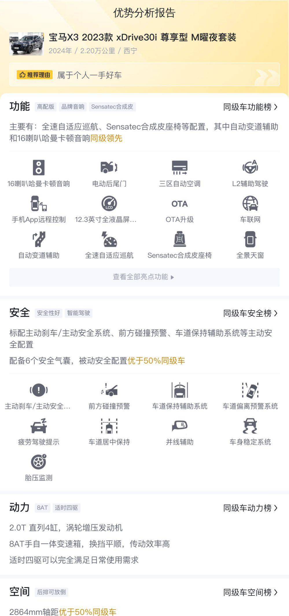 30万出头,能买到一辆2023款的宝马X3?这听起来像是一个天大的馅饼,让人忍不住怀疑其中是否有什么猫腻。但事实是,这辆行驶里程仅2.2万公里的宝马X3 xDrive30i尊享型M曜夜套装,正以31.58万元的价格在西宁等待着它的新主人。捡漏还是入坑?这是一个值得探讨的问题。今天,我们就来深度剖析这辆二手宝马X3,看看它究竟值不值得入手。