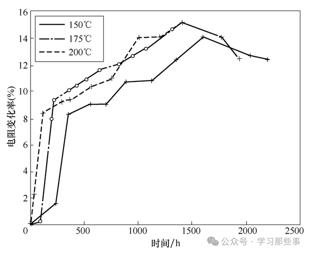 还有研究人员选择TO-254AA封装形式,在键合指上键合直径为250μm的粗铝丝,并分别在150℃、175℃、200℃的温度下进行高温储存试验,定期测量样品的电阻值,并统计电阻率的变化情况,具体如图12所示。从图中可以看出,在试验早期,样品的接触电阻变化率随时间的推移有较大幅度的上升,到试验中后期上升速度则较为缓慢。而且,环境温度越高,样品电阻变化率出现跳变并升高的时间就越早。