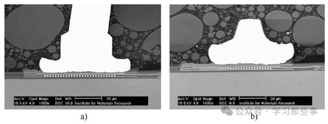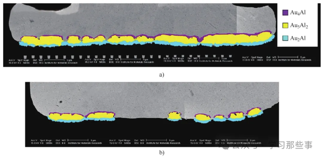 图14展示了金丝键合焊点切面的背散射电子(Back Scattered Electron,BSE)成像图。在图14a中,焊接面上生成了均匀的金铝化合物;而在图14b中,焊接面上金铝化合物的生成并不均匀。