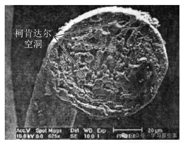 与其他金属间的结合情况类似,当IMC层过厚时,会导致界面变脆、强度下降等问题。同时,在IMC的生长过程中,由于金和铝具有不对称的扩散特性,在金铝键合体系中往往会形成柯肯达尔(Kirkendall)空洞。由于金和铝的扩散系数不同,在它们的接触面上会形成小空隙,这就是所谓的柯肯达尔效应。柯肯达尔空洞在键合界面附近形成并逐渐生长,在器件继续老化的过程中,这些小空隙会逐渐连接成片,形成裂纹,进而导致接触不良或引线脱落,最终造成开路失效。目前,普遍认为IMC和柯肯达尔空洞的生长是导致金铝引线键合失效的主要原因之一。