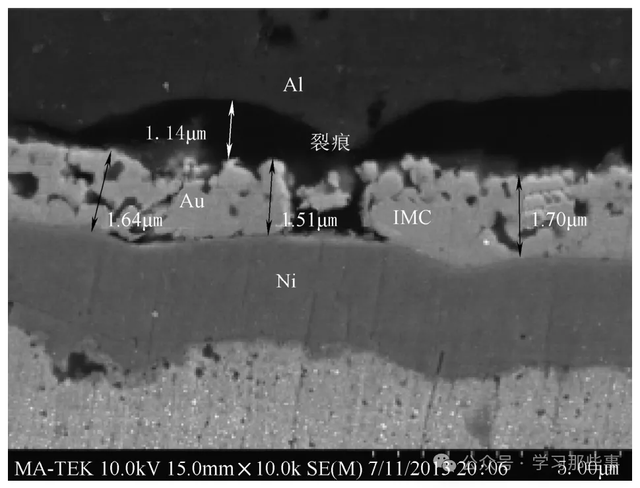 金和铝属于两种不同的金属,在它们结合的过程中,首先会生成金属间化合物(IMC)。IMC的形成是金铝键合完成的重要标志。适量的IMC能够在一定程度上增强界面的键合强度。但不可避免的是,随着器件服役时间的延长以及环境温度的升高,IMC的生成量会逐渐增加。