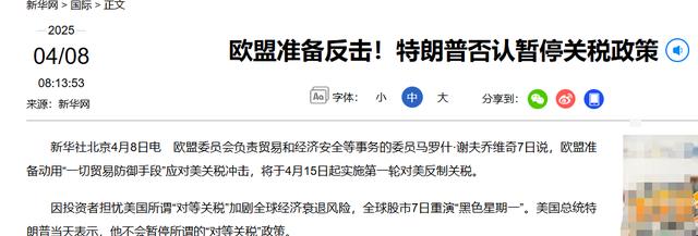 根据新华网的报道,这个事情刊登于2025年4月8日发布的《欧盟准备反击!特朗普否认暂停关税政策》