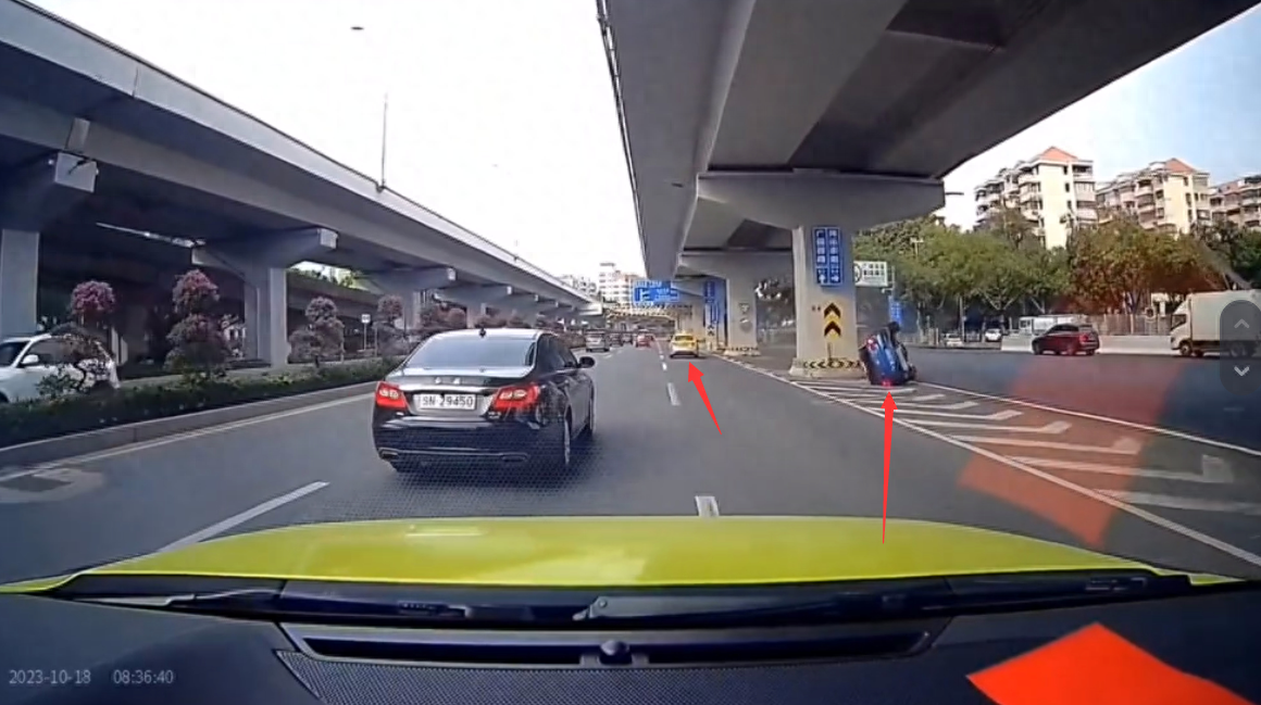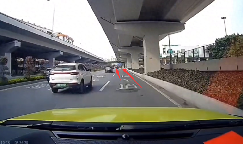 在两车相撞前,出租车一直在前,他先从中间车道转向了右边车道,然后继续加速行驶,而宝马车紧随其后,在驶入右侧车道后,丝毫没有停留,继续加速转向中间车道超车。
