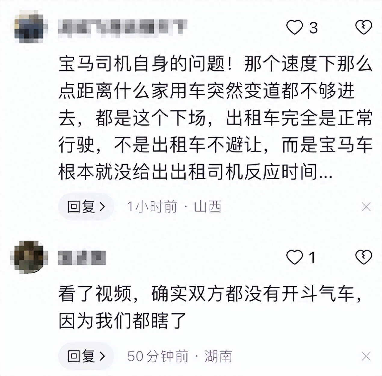 不过,从路人第三视角的行车记录仪来看,有网友认为是宝马车咎由自取,但也有人认为是出租车没有及时刹车,存在刻意行为。