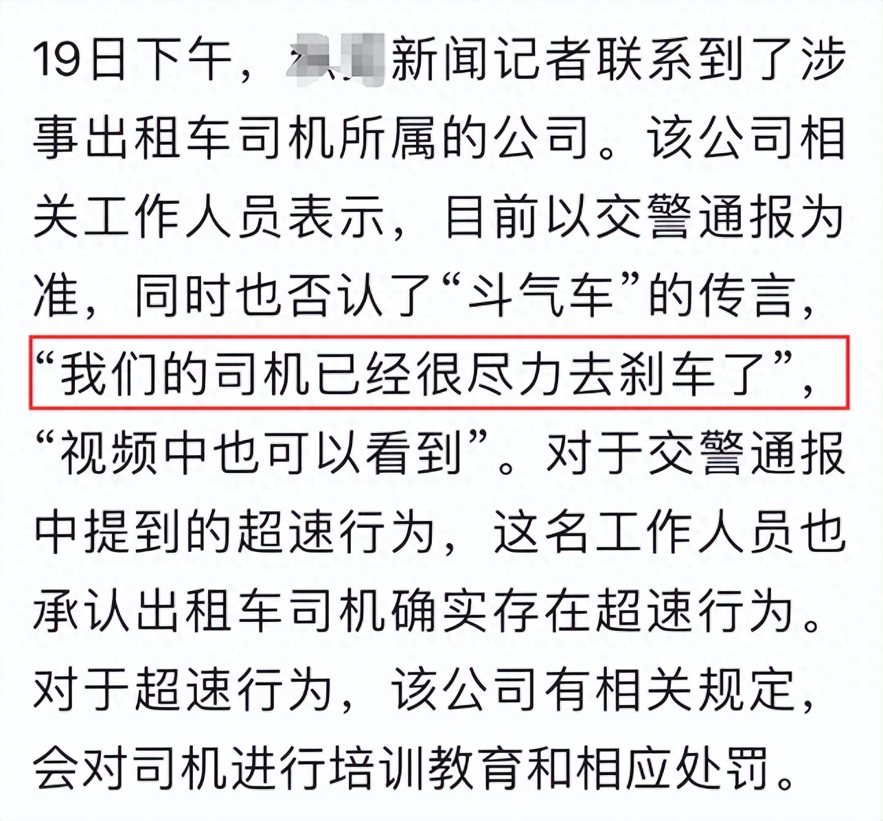 对此,出租车司机所属公司的工作人员表示,司机已经很尽力的去刹车了,对于超速行为,会对司机进行培训教育和相应处罚。