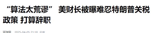 环球网2025-04-05——“算法太荒谬” 美财长被曝难忍特朗普关税政策 打算辞职