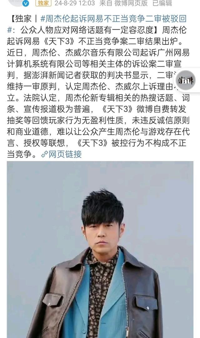 这场官司起初源于周杰伦新专辑发布后,网易游戏《天下3》在没有授权的情况下将其用作活动内容。周杰伦方显然不满这种利用其名气的行为,特别是在当时他正与腾讯合作。周杰伦方面试图通过法律途径解决这件事,以维护自身权益,然而法院最终裁定《天下3》的行为不构成对周杰伦的不正当竞争。网络上的评论也随之热闹起来,有网友戏谑周杰伦败诉后,称其法律团队“被打回了现实”。这些讨论不仅展示了公众对事件的关注,也反映了娱乐圈法律纠纷常见的复杂性。