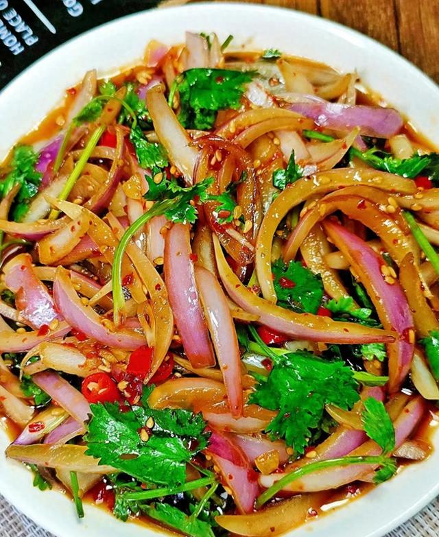 老伴切洋葱的手法很独特,她把洋葱切成细细的丝,每一根都粗细均匀。然后,她会在洋葱丝里加入适量的醋、香油和盐。那醋是本地特制的,有着浓郁的香气;香油是自家榨的,醇厚浓郁;盐也是最普通的粗盐,带着淡淡的咸味。她用筷子轻轻地搅拌着,洋葱丝在调料的包裹下,显得更加诱人。