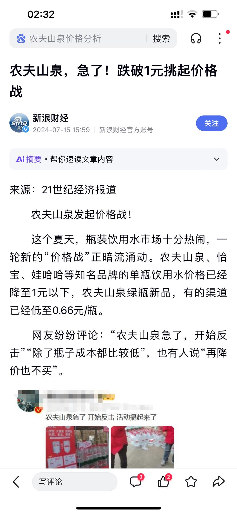 你说首富怒批拼多多是为了匡正消费市场秩序吧,农夫山泉在2024年挑起了价格战,让矿泉水又回到了1元时代,让同行苦不堪言。而且高于10块钱的品牌老板diss 拼多多,这都可以理解,但卖矿泉水的也diss拼多多,这有点驴唇对马嘴了;