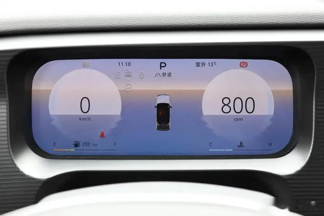 这款车的仪表盘是全液晶的,画质清晰明了,上面显示的功能也比较多,左右两侧是圆形界面,左边显示速度,右边可以设置为音乐播放、保养记录、地图导航等,还有就是上部是时间、挡位、温度等常规信息,笔者觉得挺人性化的。