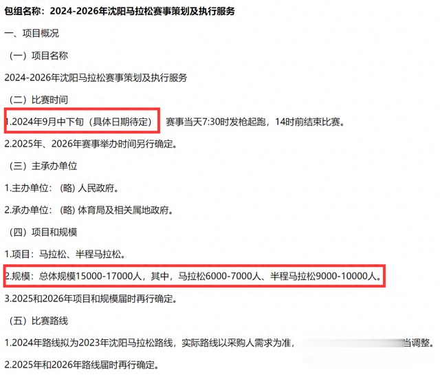 另外,招标文件要求中标人2024年达标世界田联精英标牌赛事; 2025年和2026年确保沈阳马拉松于2026年达标世界田联金标牌赛事。