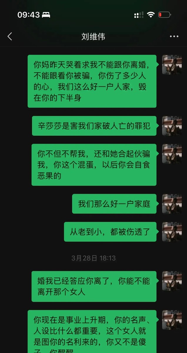 结果没有想到这条信息直接就被辛莎莎的老公抓包,但这并没有阻碍刘维伟与辛莎莎两人继续婚内出轨。