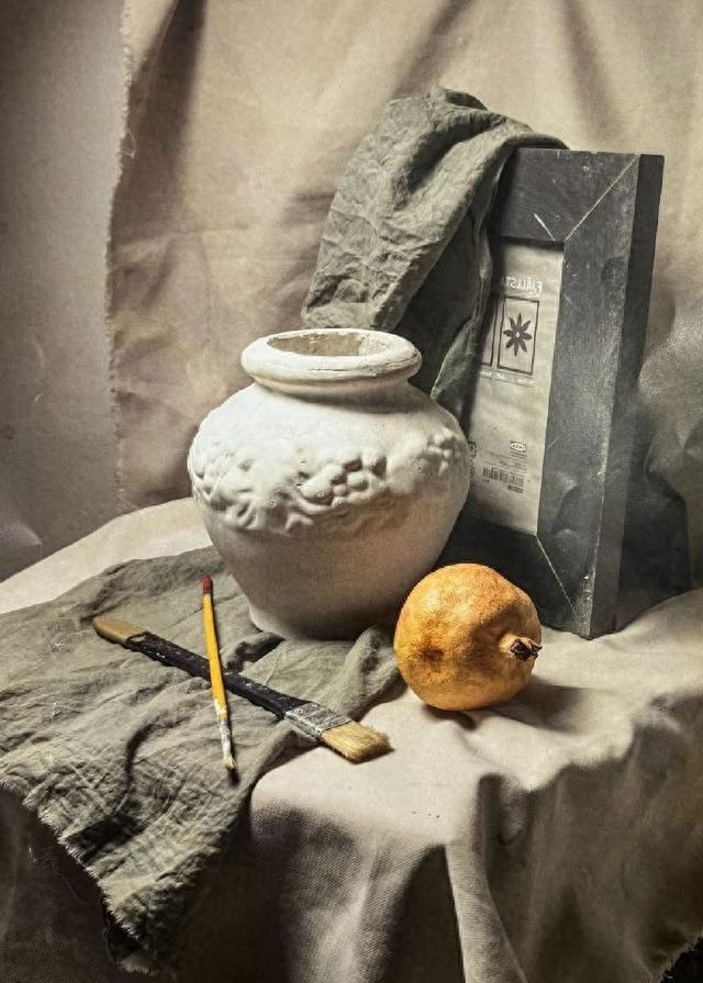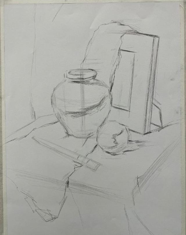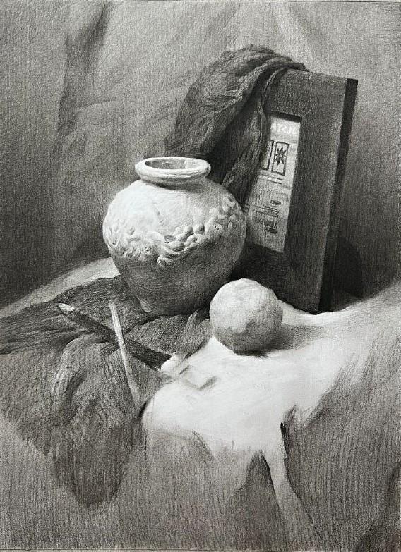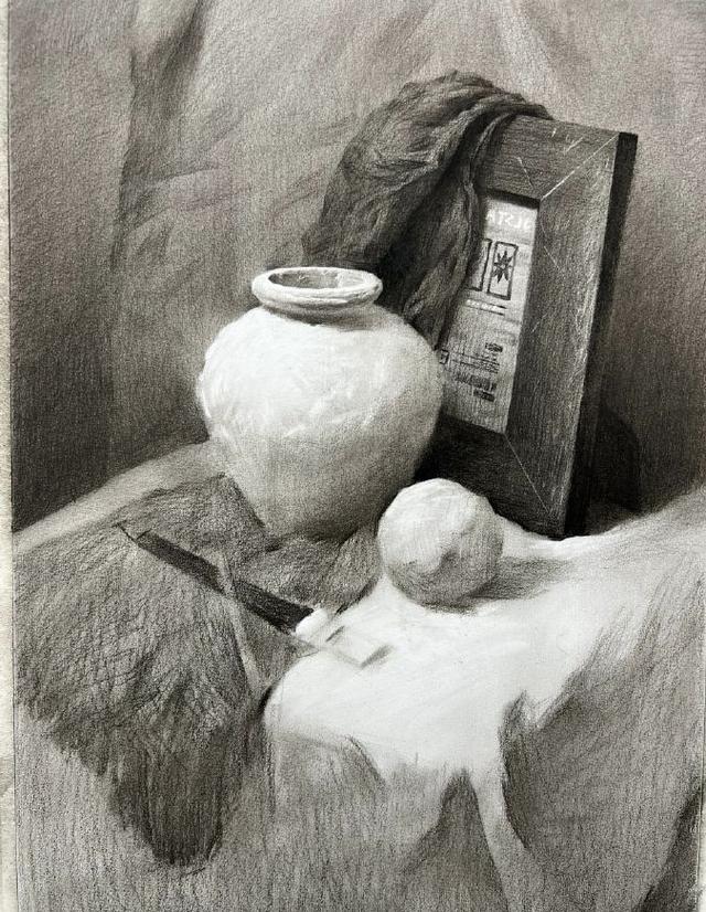 第一步,构图起形,观察整体画面,注意物体的摆放位置,做到画面饱满,主次明确。第二步:快速统一暗面,建立画面光的关系。第三步,塑造暗面,同时带出桌台,衬布,背景的固有颜色。第四步:深入塑造,从画面最暗的地方入手,进行由暗到灰.到亮的逐步推移,注意整体比较。不同质感的物体,分别采用相应的线条排列方式,注意线条的方向性,要让线条真正附着在形体上,并注意画面的主次虚实关系。