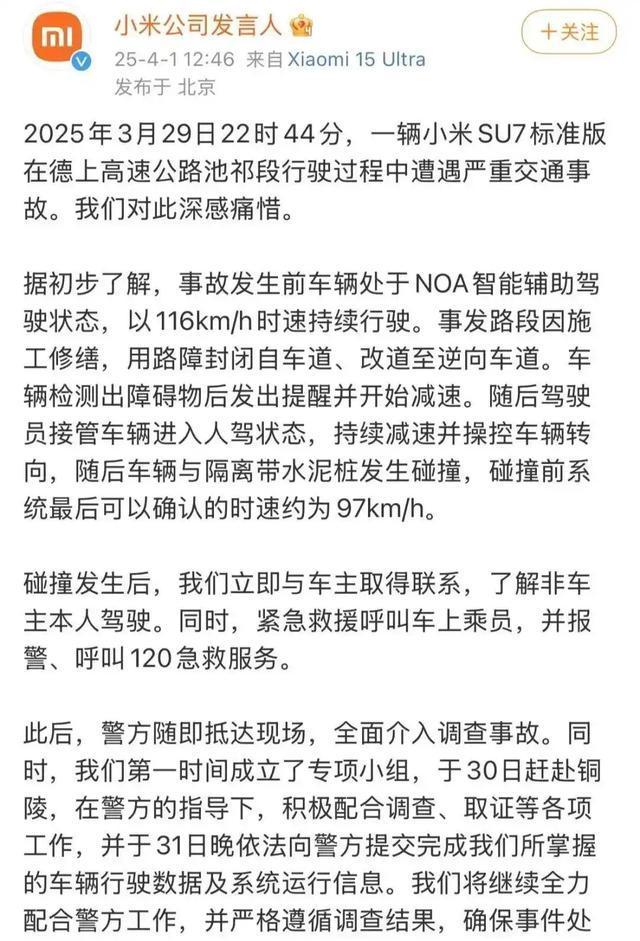 话说2025年3月29日,安徽铜陵德上高速,一辆小米SU7标准版就像一颗流星一样撞上了隔离带,然后,“Duang”的一声,直接原地爆炸。