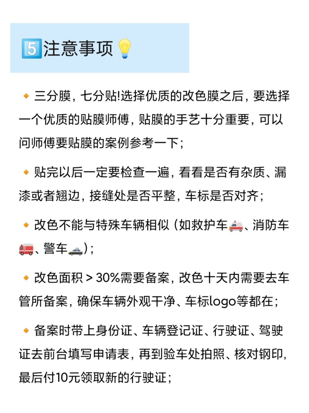 📍改色面积>30%需要备案,改色十天内需要去车管所备案,确保车辆外观干净、车标logo等都在;