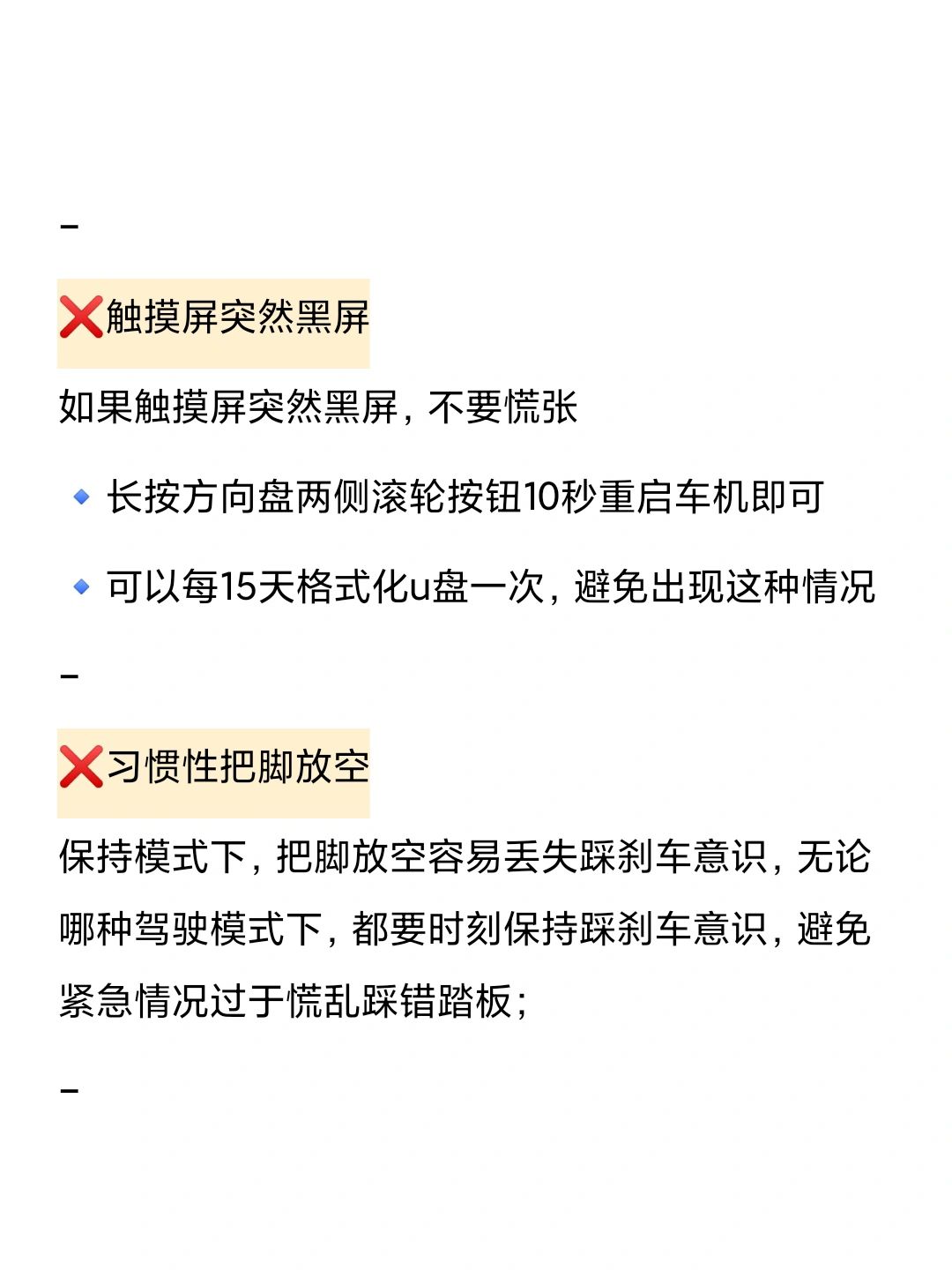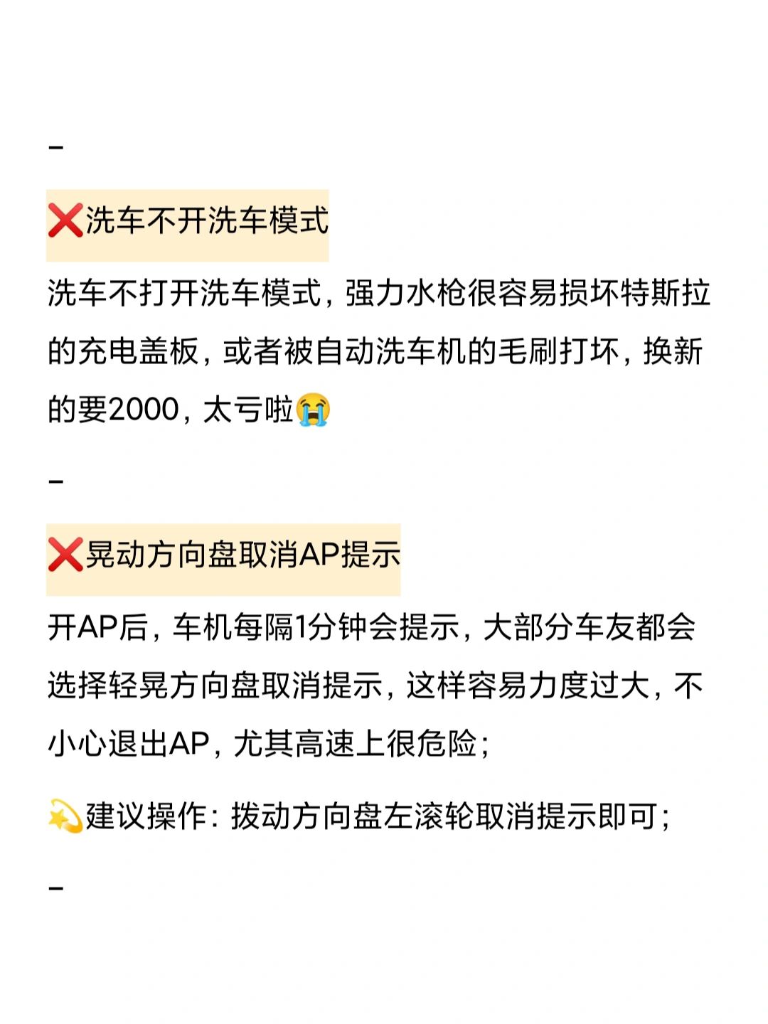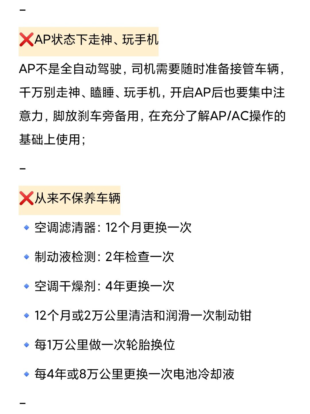 AP不是全自动驾驶,司机需要随时准备接管车辆,千万别走神、瞌睡、玩手机,开启AP后也要集中注意力,脚放刹车旁备用,在充分了解AP/AC操作的基础上使用;