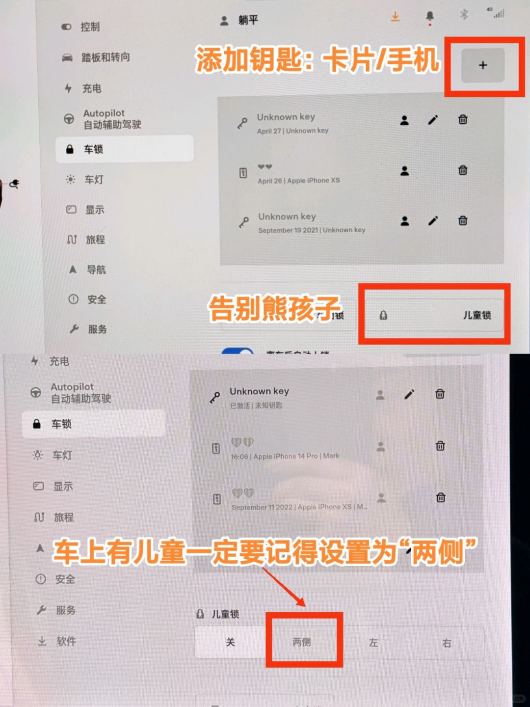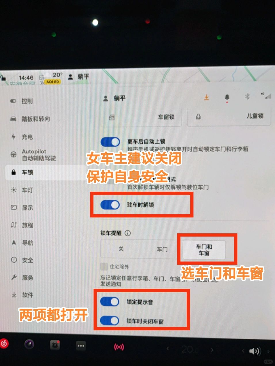①驻车时解锁设置:车辆→车锁→驻车时解锁(建议女生关闭驻车时解锁,更加安全)